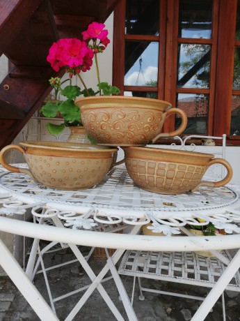 Vysoko pálená kamenina, malované. Vhodné do myčky i mikrovlnné trouby. Dekor - kostka, spirála, puntík.