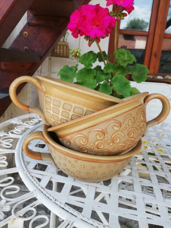 Vysoko pálená kamenina, malované. Vhodné do myčky i mikrovlnné trouby. Dekor - kostka, spirála, puntík.